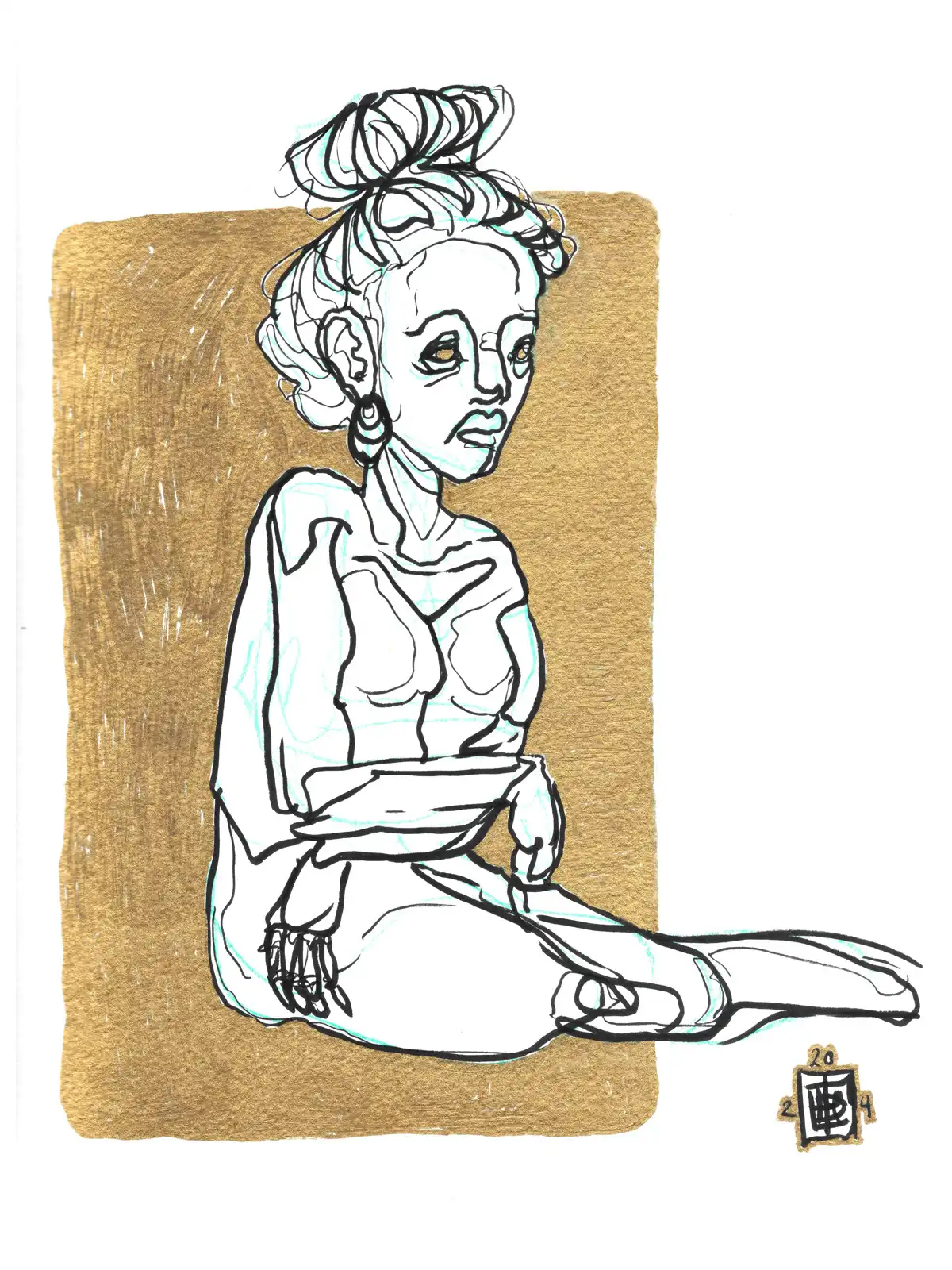 Découvrez « Golden Girl » d’Estelle D Rampin, une œuvre captivante qui allie minimalisme et expressivité. Avec des traits noirs anguleux, elle représente une femme en posture introspective sur un fond doré texturé. Ce contraste saisissant évoque la lutte entre force et fragilité, invitant le spectateur à explorer la beauté de la vulnérabilité humaine et la résilience silencieuse. Une pièce qui promet un voyage émotionnel profond.