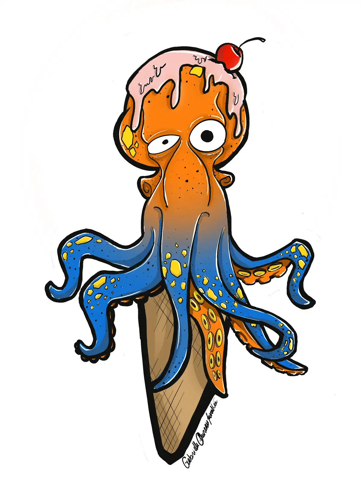 Pieuvre glacée, dessin de Gabrielle Favreau-Lavallée, une artiste québécoise, imprimé sur différents articles, t-shirt, coton outaé, verre, coussin, tablier, etc.